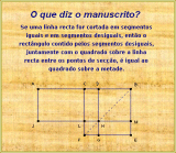 Este extracto, que alguns entendidos intitulam de Teoria da Reminiscência, é o ponto de partida para uma pequena incursão pela História da Matemática. A ficha de trabalho (apresentada a seguir) pode ser trabalhada com alunos do 7.º e 8.º anos de escolaridade. É uma oportunidade para os alunos descodificarem uma geometria não aritmética, cujos elementos são combinados, comparados e transformados. Aproveita-se ainda a oportunidade para um primeiro contacto com a irracionalidade de raiz de 2, demonstrada, segundo consta, pela forma mais antiga que se conhece e que é atribuída a Pitágoras. A ficha de trabalho termina com a apresentação de uma banda desenhada (retirada do livro Mais Matemáticas Assassinas, Kjartan Poskitt, Ilustrado por Philip Reeve, Publicações Europa-América), que aflora a (hipotética) história da punição de Hippasus pela quebra do segredo dos números incomensuráveis (ver as ligações: 1 e 2, por exemplo). Face à previsível dificuldade dos alunos em interpretar e acompanhar o diálogo, é esperado que o professor faça o devido acompanhamento dos mesmos.